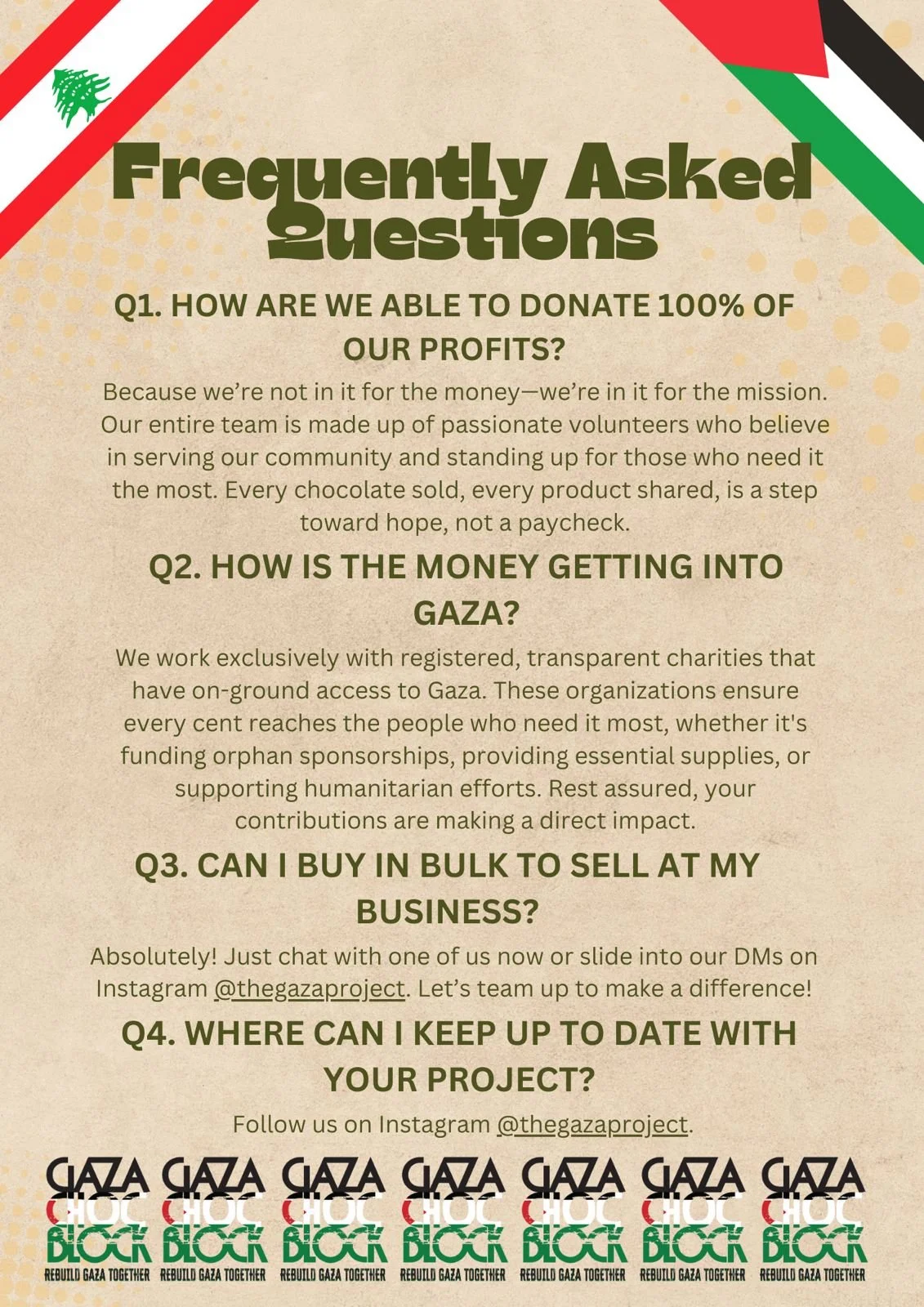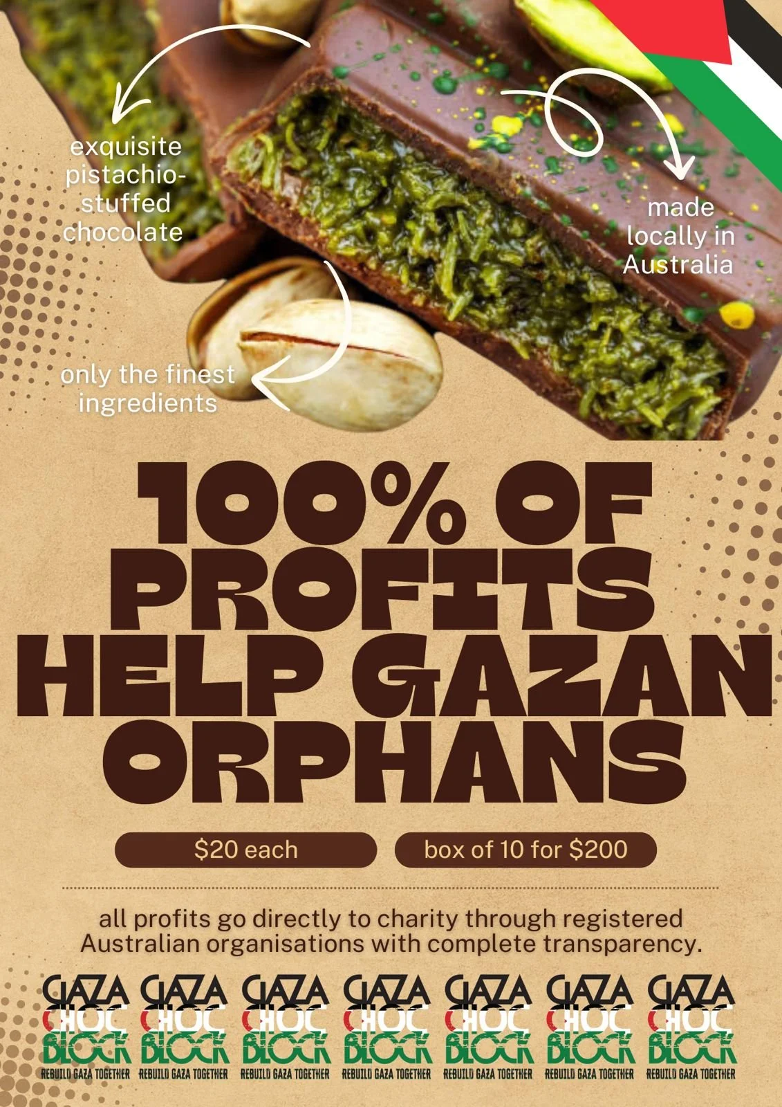 Another initiative we are working on is the "Gaza Choc Block"—a delicious chocolate inspired by Palestinian knafeh and pistachio filling. All profits from this chocolate are donated to Gaza to support humanitarian aid.